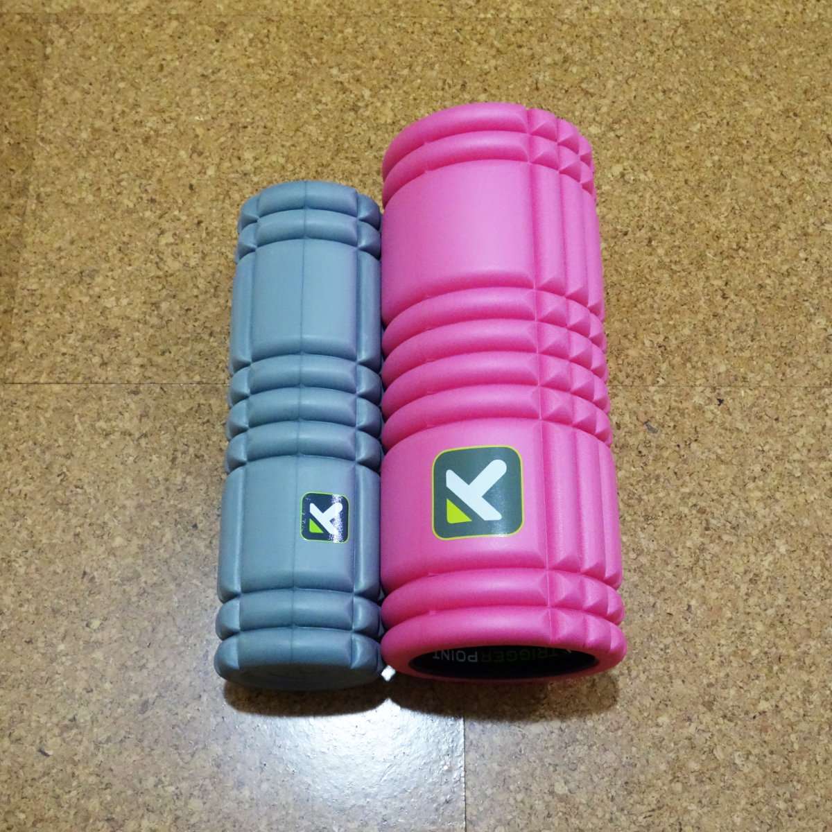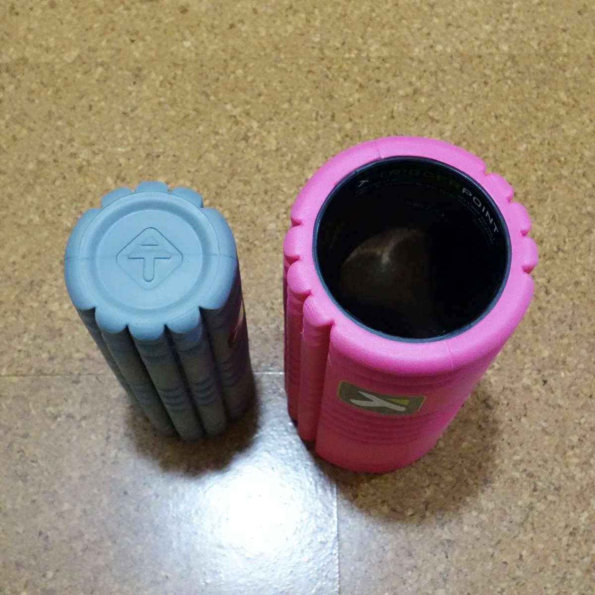 同じトリガーポイントの通常サイズのフォームローラーと比べると半分程度のサイズです。通常サイズは中が塩ビパイプのようになっているので少し硬めで弾性があります。ミニの方は全体的に少し柔らかく初めて使うならミニがよいかもしれません。