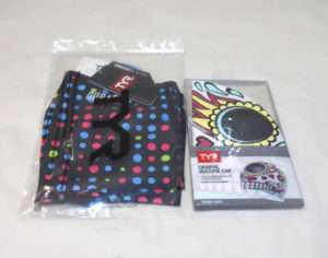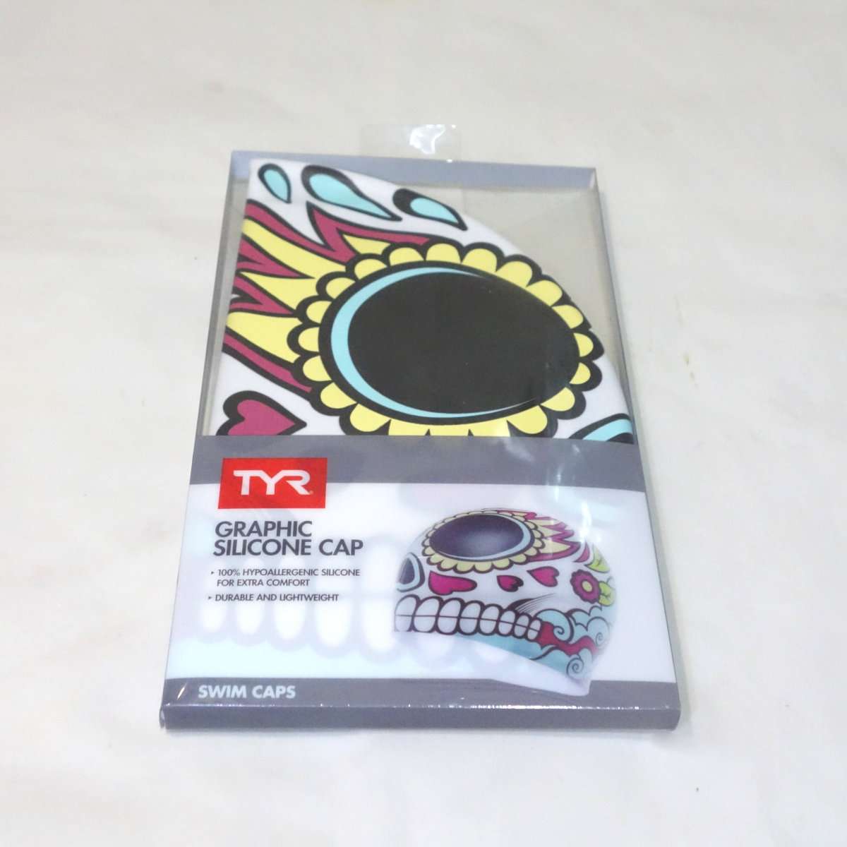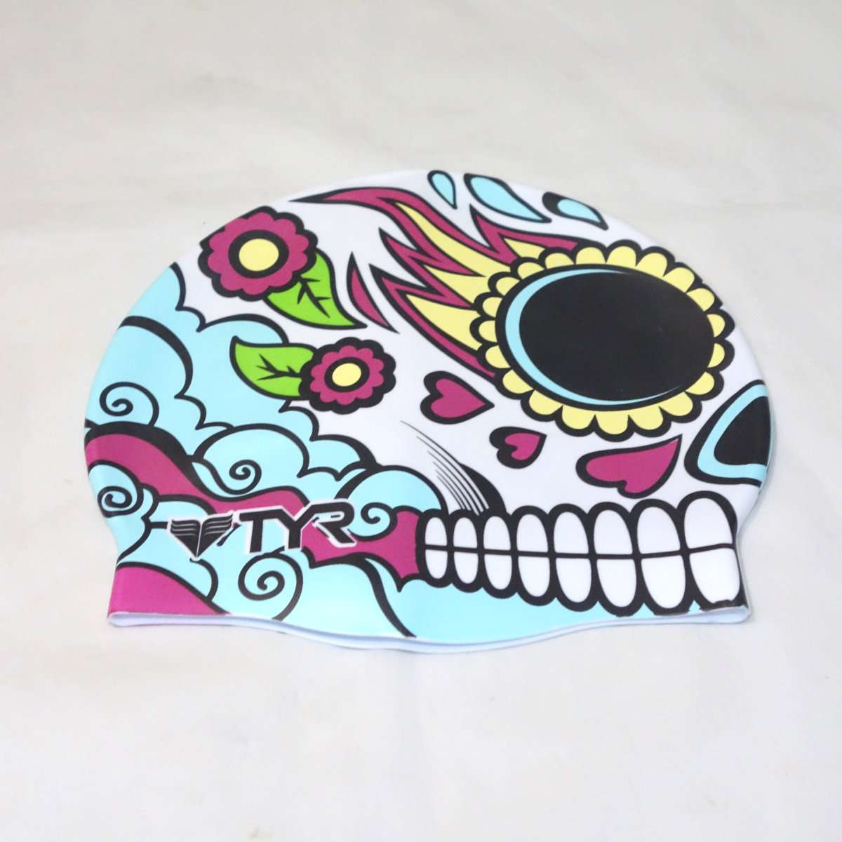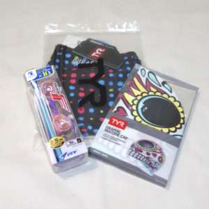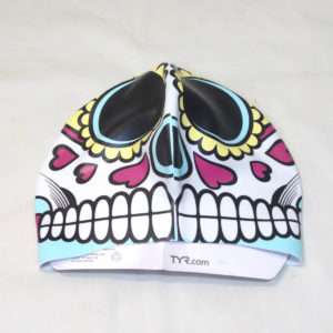 開封してみると派手はキャップが出てきます。ガイコツ柄で007の映画にも出てきたメキシコの死者の日の祭りの様なデザインになっています。右側の後ろ側にはTYRのロゴがあります。キャップの形状は水着と同様にSpeedoのシリコンキャップとほぼ同じ形状になっています。これで大きな競泳の大会に出る方はまず居ないと思いますが、FINA承認のキャップではありません。FINA承認は世界記録や日本記録を出した時に必要なだけなので普段の練習や地方大会では関係ありません。
