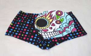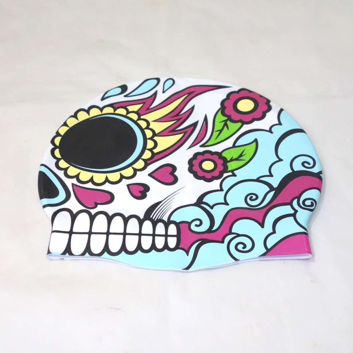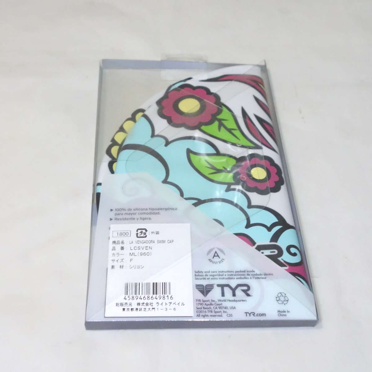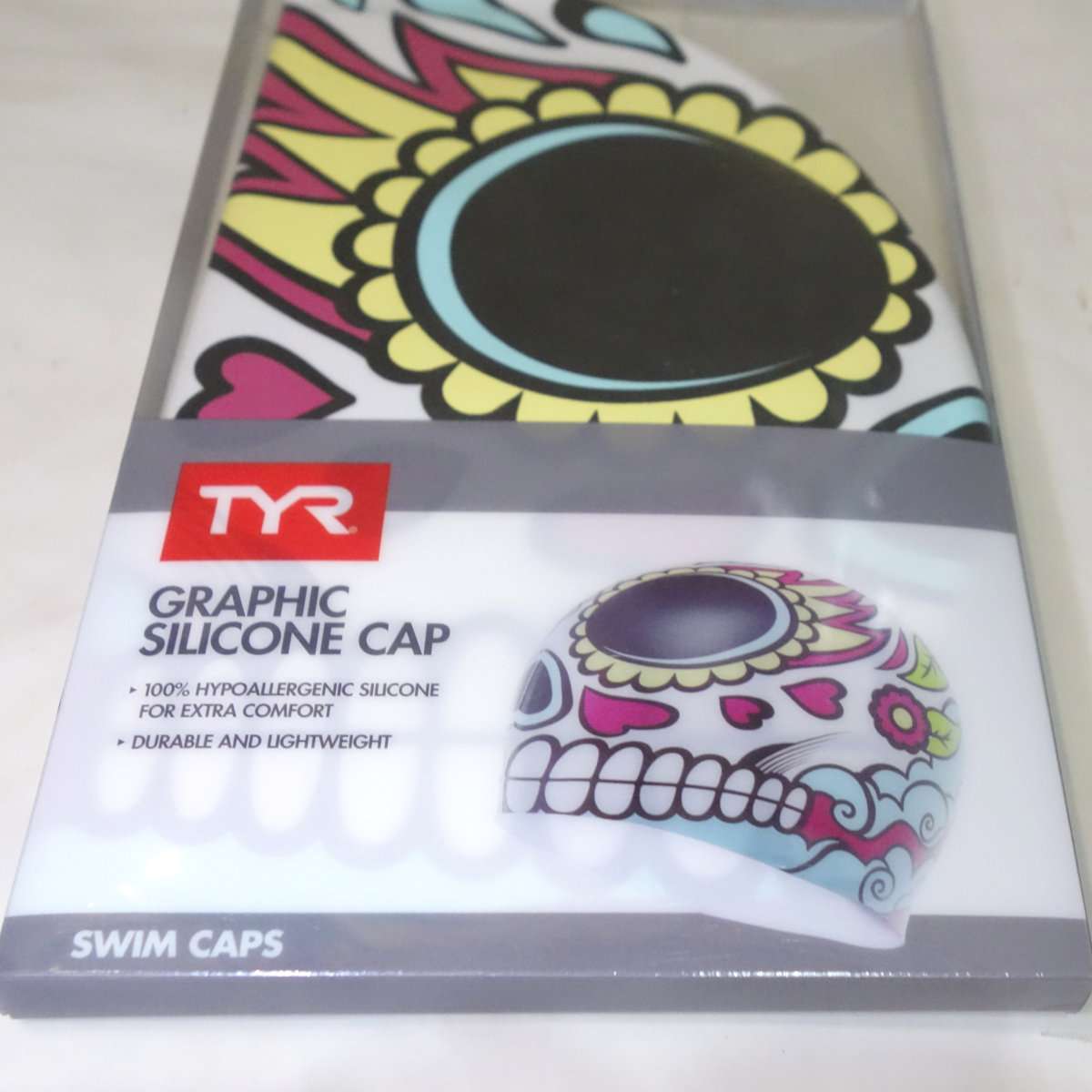 開封してみると派手はキャップが出てきます。ガイコツ柄で007の映画にも出てきたメキシコの死者の日の祭りの様なデザインになっています。右側の後ろ側にはTYRのロゴがあります。キャップの形状は水着と同様にSpeedoのシリコンキャップとほぼ同じ形状になっています。これで大きな競泳の大会に出る方はまず居ないと思いますが、FINA承認のキャップではありません。FINA承認は世界記録や日本記録を出した時に必要なだけなので普段の練習や地方大会では関係ありません。