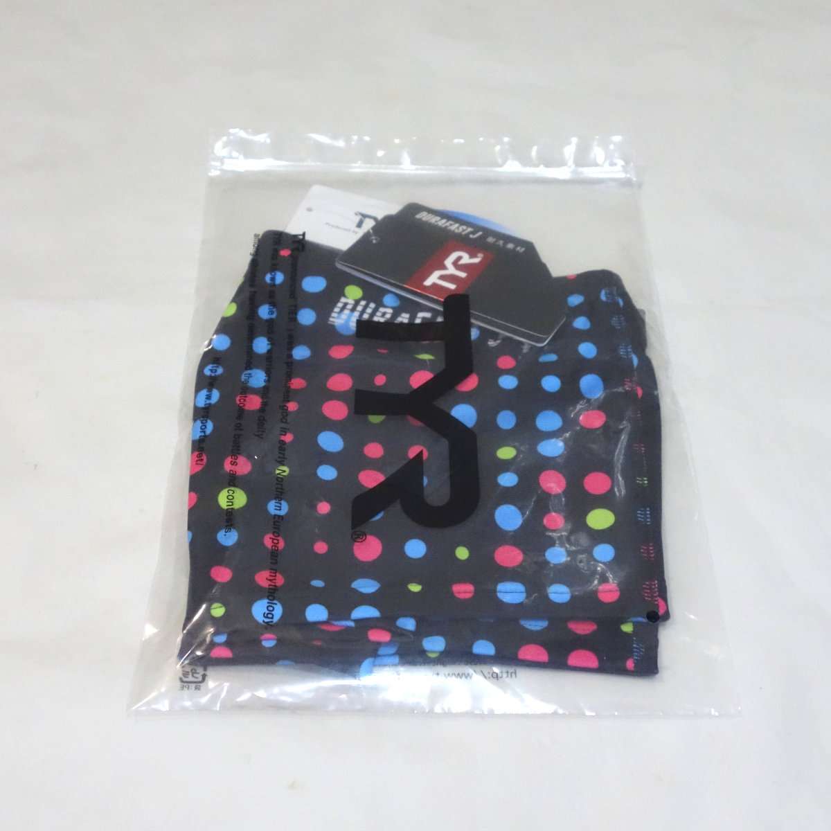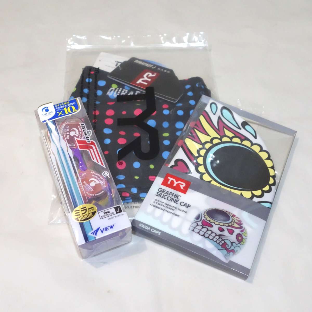 今回の水着はTYR(ティア)のドット柄のトレーニング用ボックスタイプで型番BMTRX-19カラーはML(マルチ)、シリコンキャップの商品名はLA VENGADORA SWIM CAP型番LCSVENカラーはML(960)になります。水着と違ってシリコンキャップはフリーサイズのみです。ゴーグルもTYRのが欲しかったのですが、最近メインで使っているVIEWのBLADE Fのミラーレンズのものにしました。