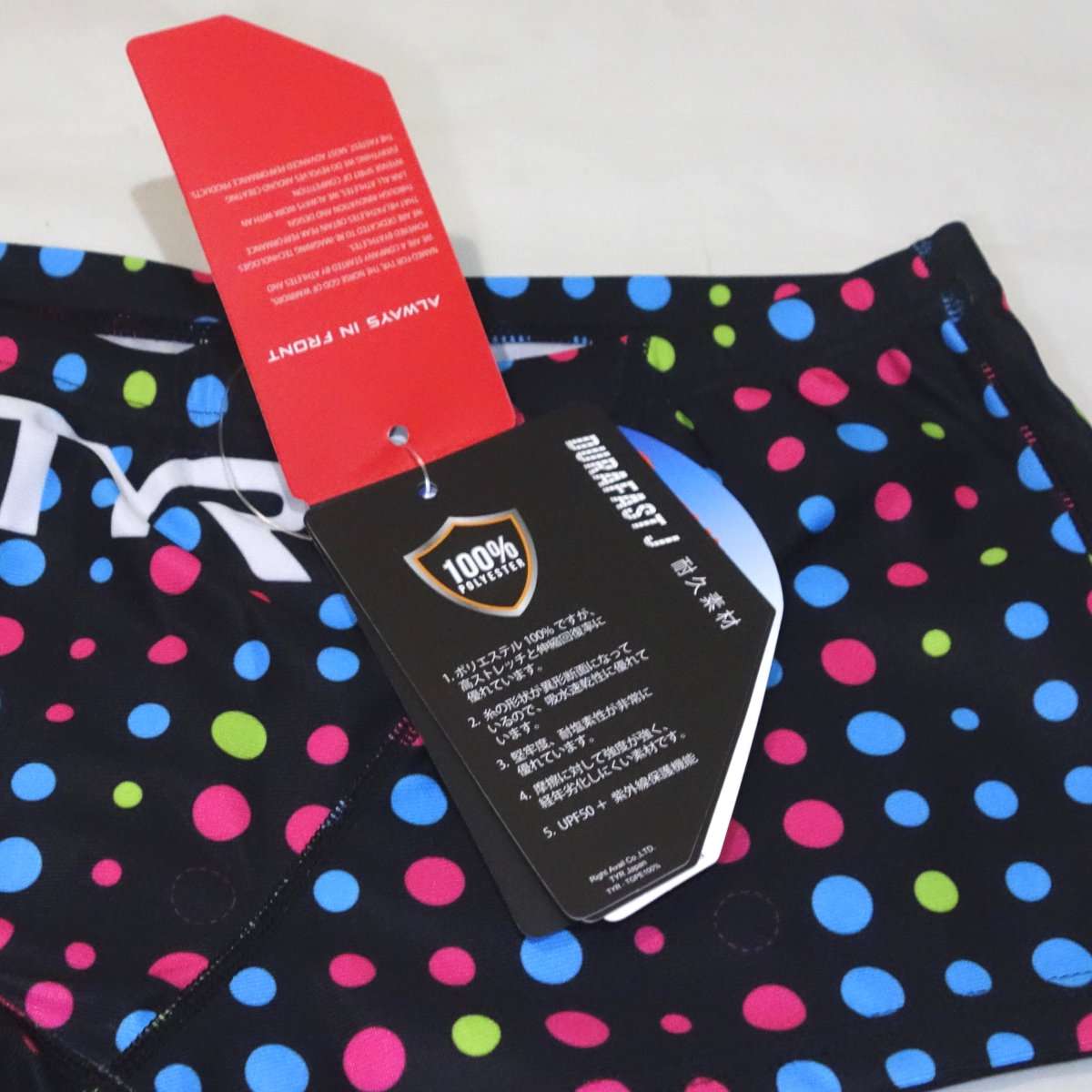 TYRはアメリカ・カルフォルニアのブランドですが、この水着は日本製です。SpeedoやArenaも日本で展開しているのは、日本のディストリビューターでレース用の特殊な物を除いて日本企画(とアジア向け)の物がほとんどです。このボックス水着も日本企画の物と思われます。このへんはMammut(マムート)などアウトドア系ブランドと同じで日本人サイズを基本に日本企画の製品を展開しています。