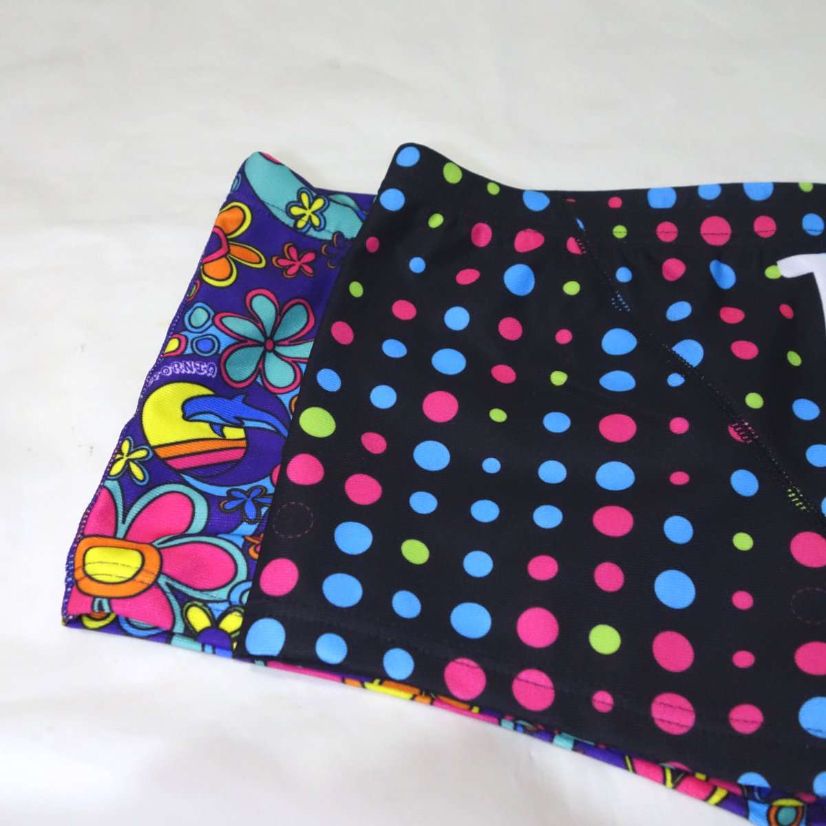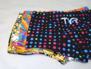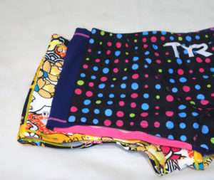以前から使用しているTYRの同様のボックス水着と比べてみます。丈もカットも同じで大きな違いは見受けられません。下の花柄はカラフルですが水につけるとかなり地味になるので水着を選ぶ時はその辺も考慮した方がよいでしょう。