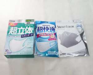 今回購入したのはユニチャームの超立体マスク、超快適マスク、スマートカラーの3種類でカラーは超立体と超快適が通常のホワイトでスマートカラーだけグレーになります。
