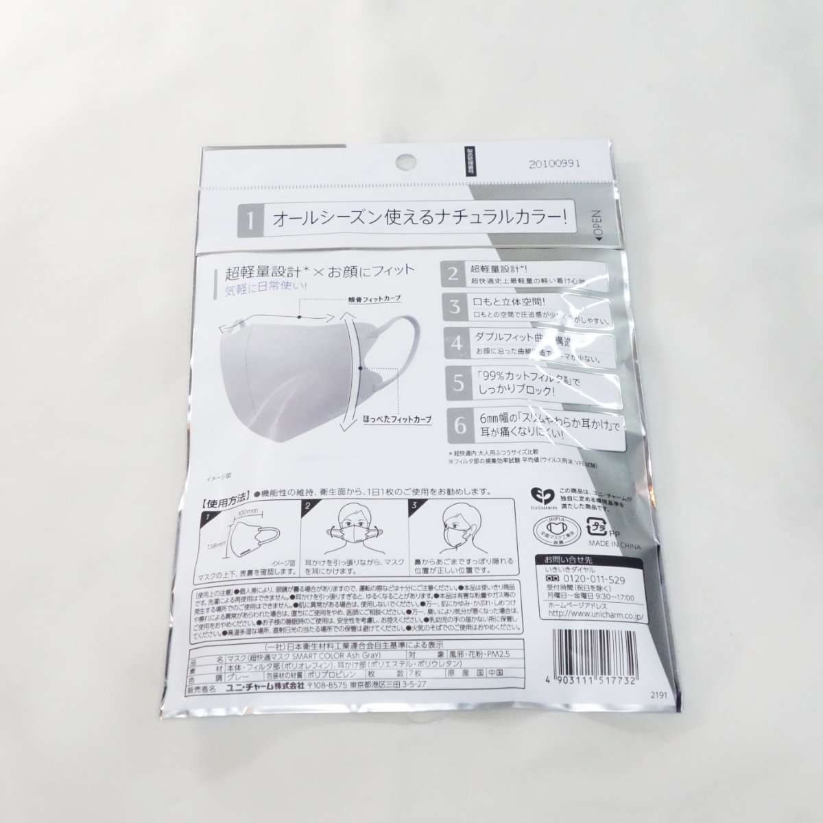 比較的新しい同じユニチャームのスマートカラーです。スマートカラーと言うだけにカラーの展開でグレーを選んでみました。作りがよく耳のバンドも痛くなくよいマスクなのでこちらを使う事にしました。一時期販売中止か出荷停止になっていましたが、現在(2022年5月)在庫があるストアもあるようです。