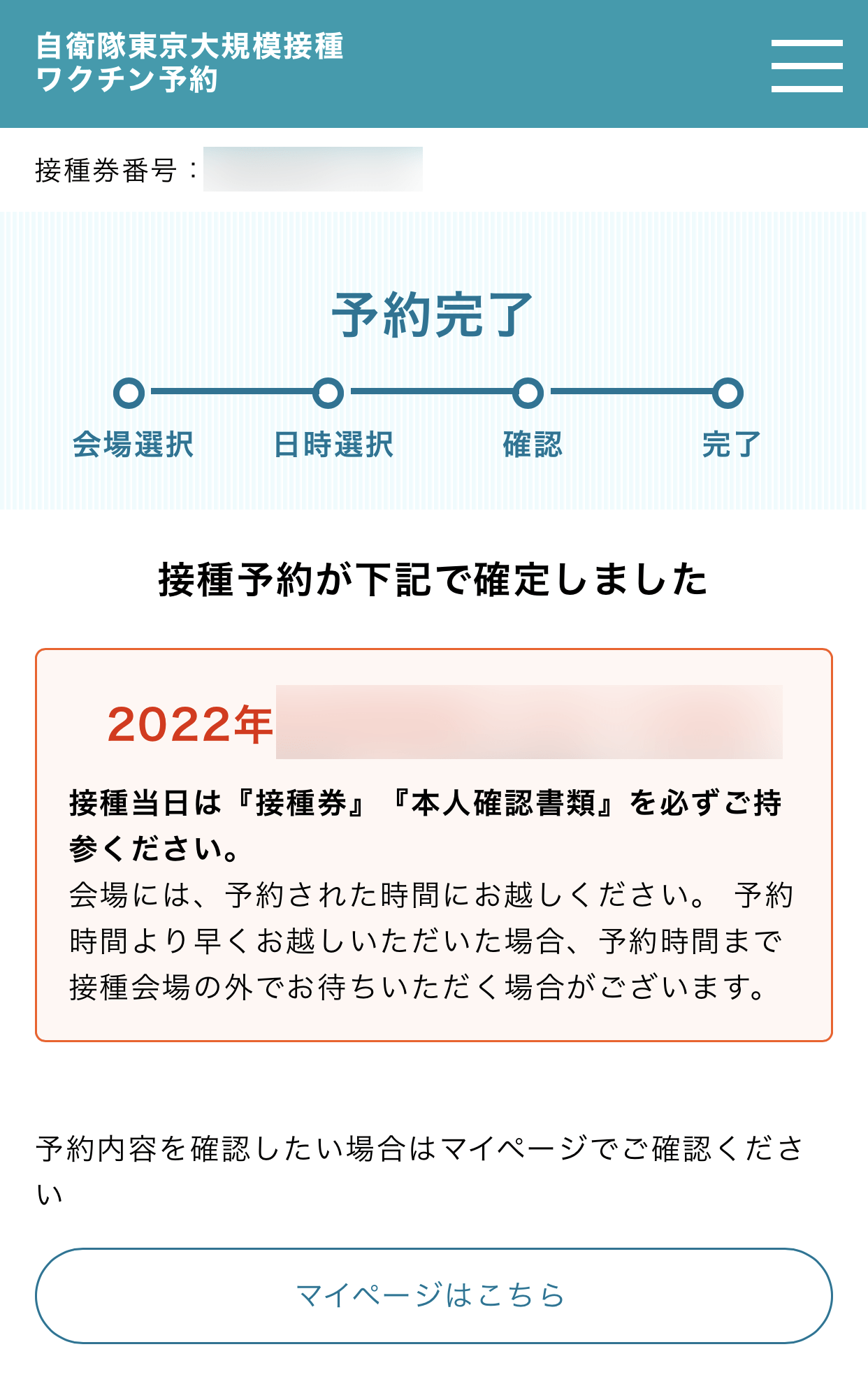 予約が完了したら予約がされているか、再度同じサイトにログインしてマイページで予約の詳細の確認をしましょう。予約情報のページをスクリーンなど撮っておくと当日スマホの電波などが不調でも慌てる事はありません。もし予約時間の変更やキャンセルが必要な場合もマイページから可能になります。