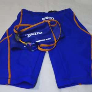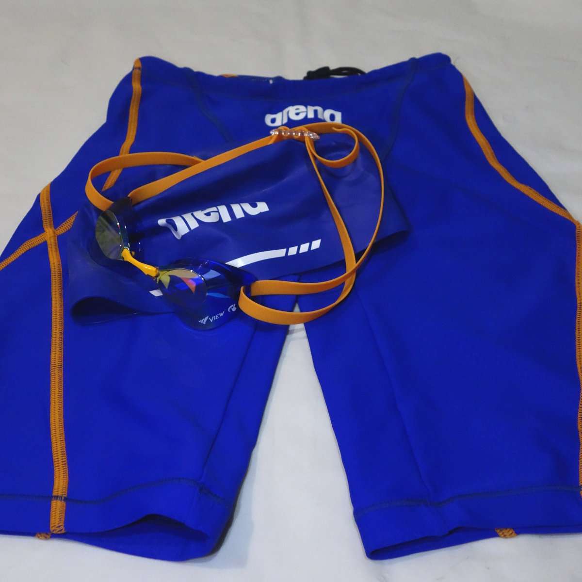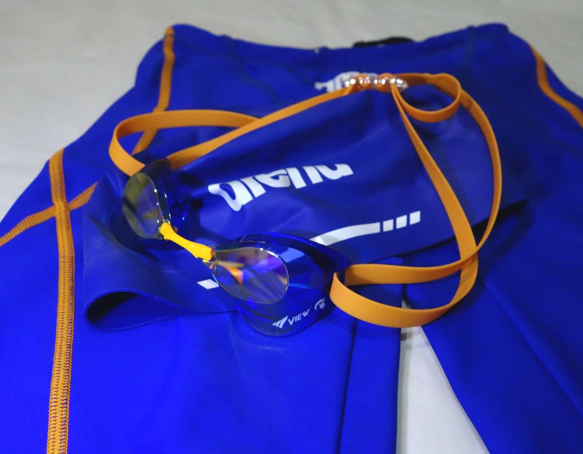 せっかくなのでゴーグルを水着とキャップに合わせてみました。アリーナのウロコスキンのスパッツモデルとアリーナの3Dキャップがほぼ同色なので見た目はかなり良いです。