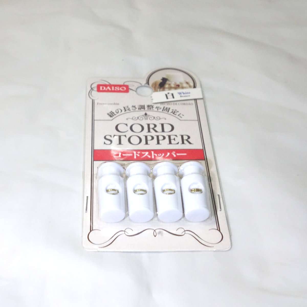 丸紐とは別に2種類の留め具を揃えました。留め具の商品名はコードストッパーで100円ショップの手芸コーナーに置いてあります。ダイソーで最初に見つけて白いのを購入したのですが、その後に近所でYKK製のより小型のを見つけました。黒いコードストッパーの方は小型なだけではなくスプリング部分が見えづらくダイソーの100円で4つ入りと違い2つ入りな事もあり質感も高いので今回はこちらを使用する事にしました。パーツがバラバラにならないようにコードストッパーの隙間にバスボンドなどを流して込んでおくのもよいでしょう。