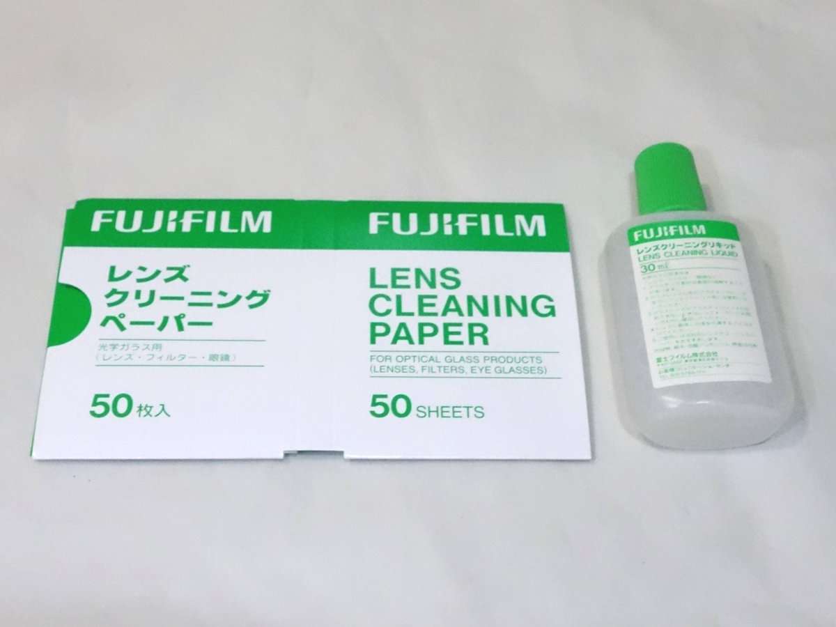 レンズやファインダーのクリーニングには毛羽立たずカビも含めた汚れが落ちがよいフジフィルムのレンズクリーニングペーパーとリキッドを使用しています。レンズクリーニングペーパーはサイズが大きい物がほとんどですが、これだと通常のレンズやファインダーを綺麗にするだけには大きすぎるのでいつも細かく切って使用しています。この時まとめて切っておくと便利ですが、切るのに使うハサミは粘着性のあるテープなどに使っていない専用の物を用意しましょう。