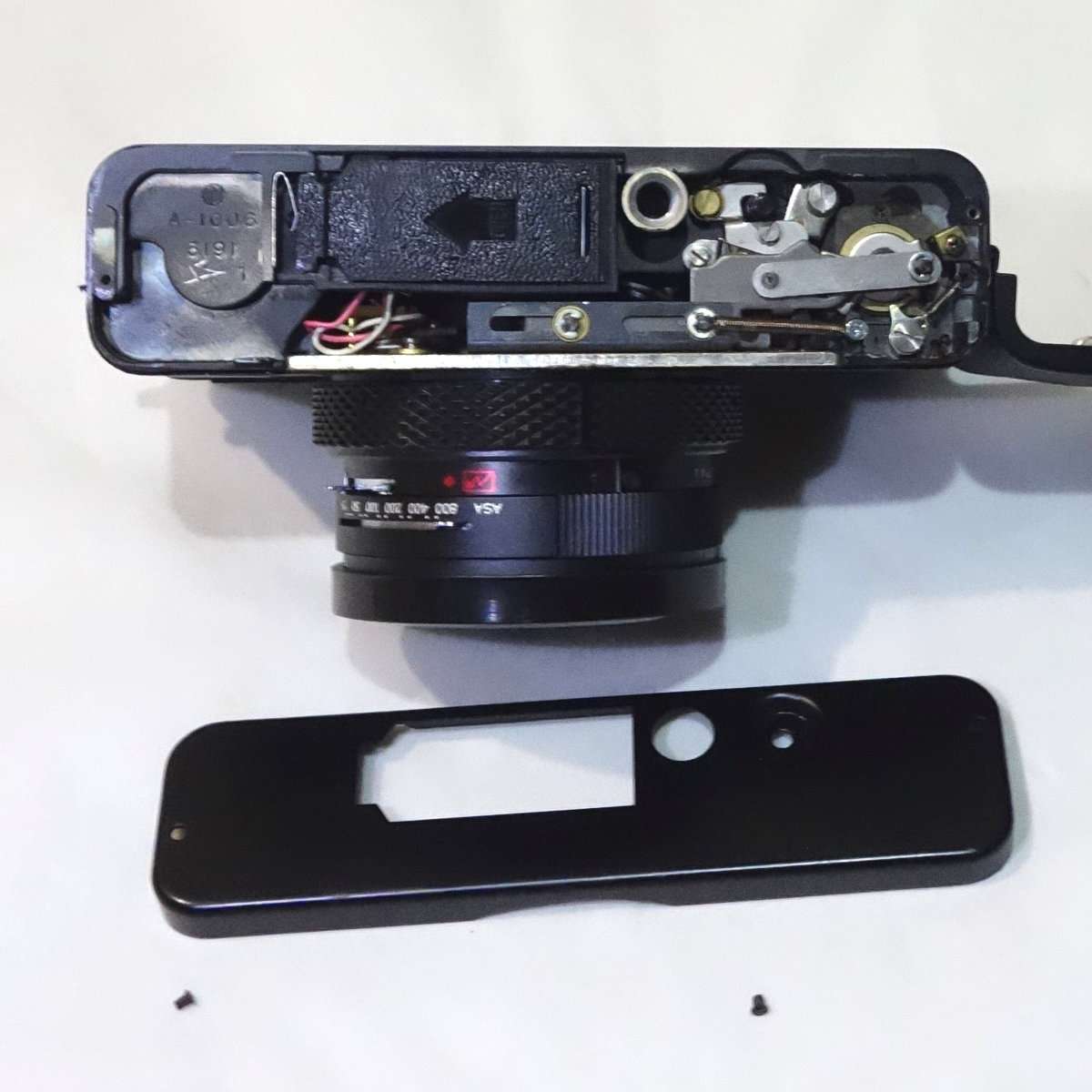 電池を入れ動作が確認出来たカメラですが、ファインダーが綺麗な方が撮影するにも気分が高まります。今回はファインダーのクリーニングと共に底蓋カバーをはずしてパーツの脱落も直したので手順などを含めて書いていきます。