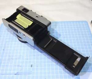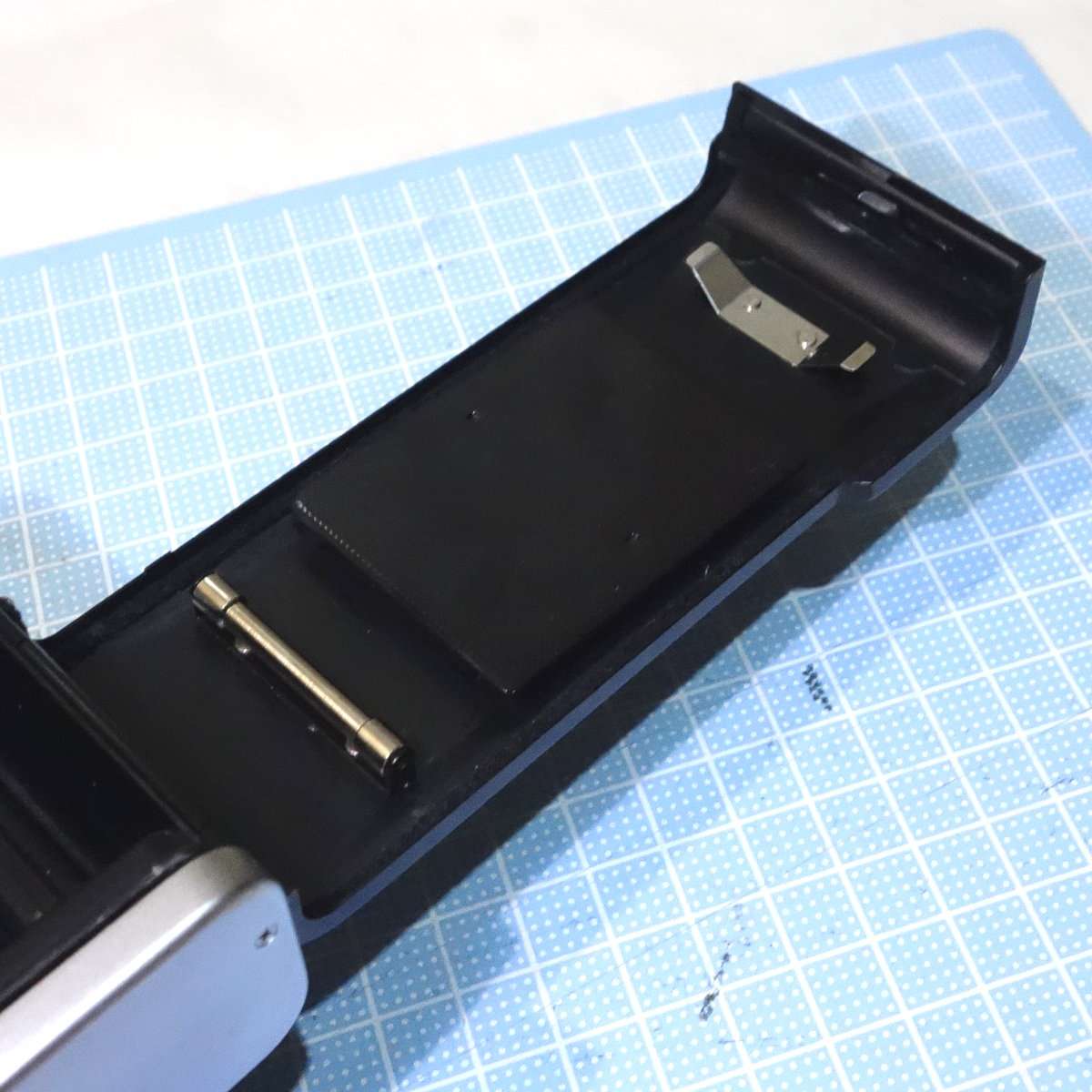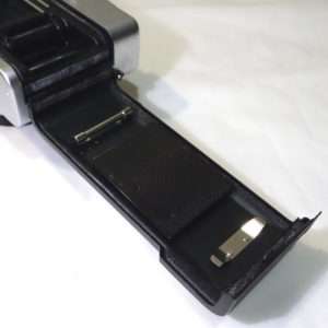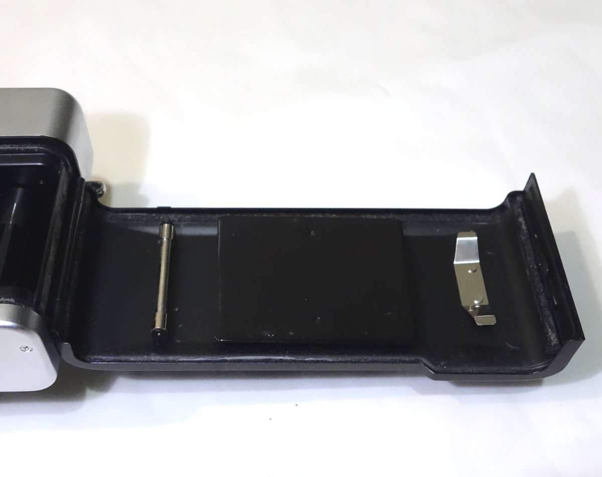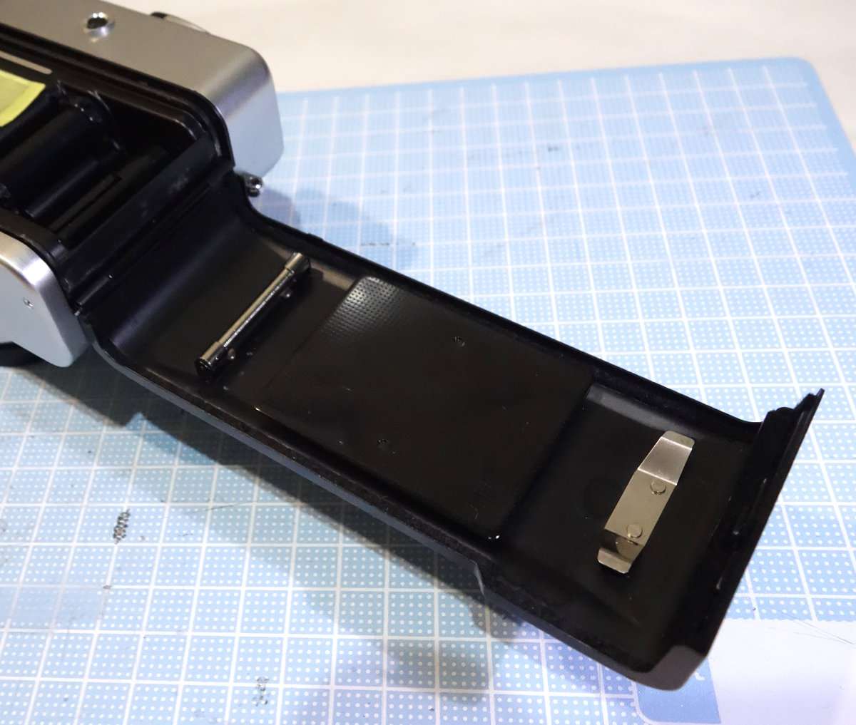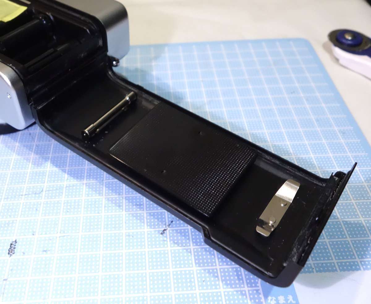 まずは裏蓋を開けて現状を確認します。古いモルトがフィルムボックス内にたまっていたりするので、清掃する前に古いモルトのカスやゴミなどをブロアで飛ばします。ブロアを吹く時はゴミが落ちるよう吹く部分を上に向けてブロアを吹きましょう。