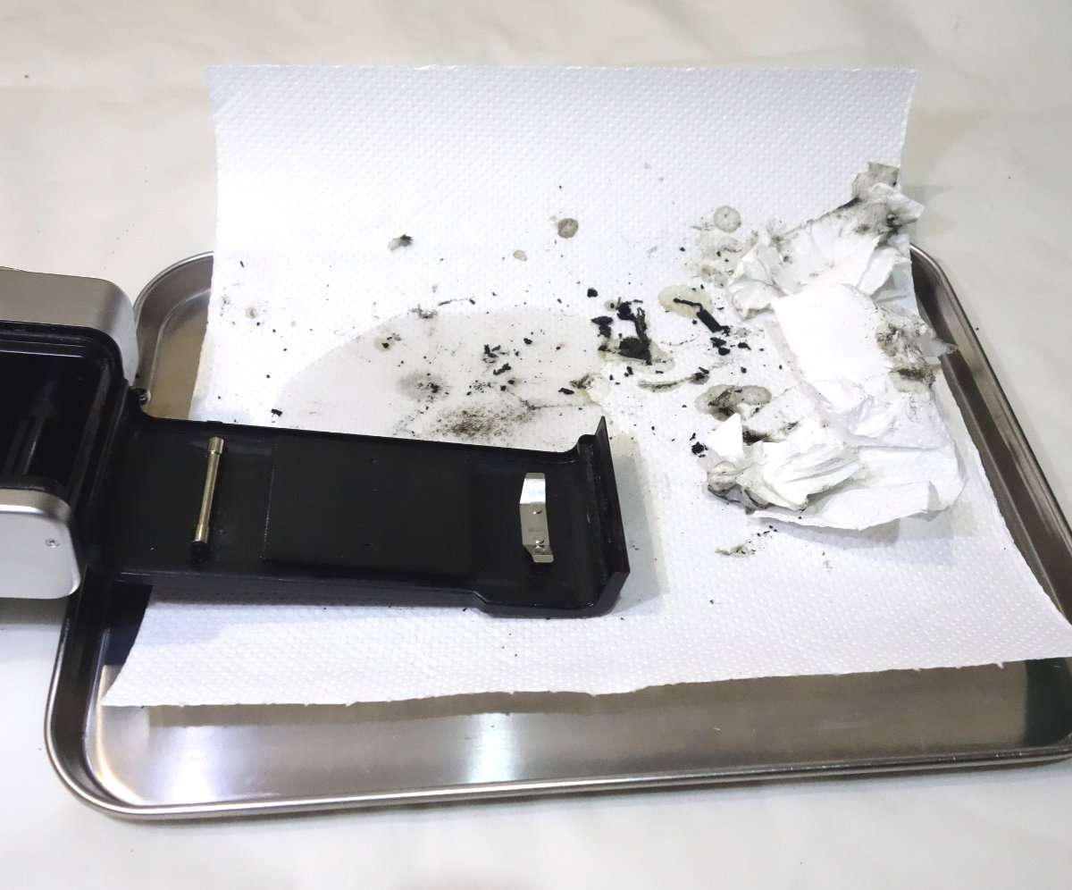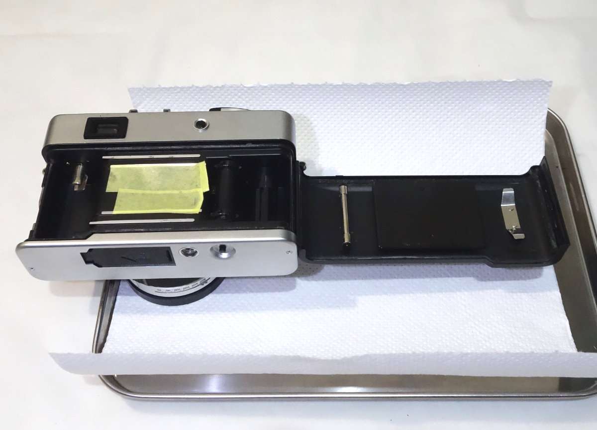 フィルムボックス内が綺麗になったらレンズ部分にゴミが入らないようにマスキングテープで養生をします。状態によってはかなり汚れますので、アルミトレイにキッチンペーパーをひくと清掃しやすくなります。他のメンテナンスなどがある場合は裏蓋を取りはずした方がやりやすくなります。