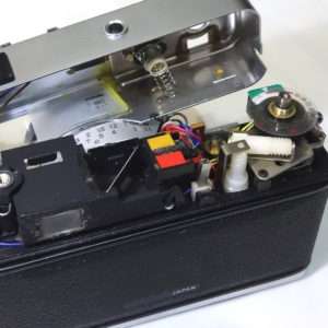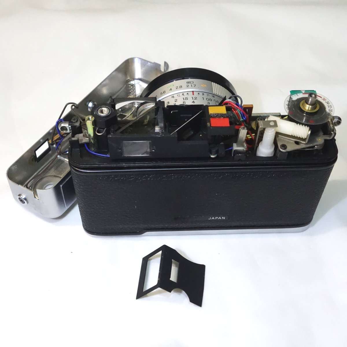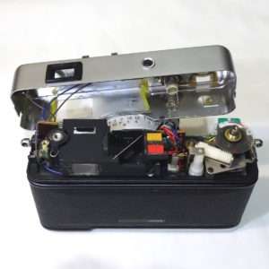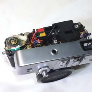 エレクトロ35GXはシャッターのチャージレバーが渋くなる事が多く、これもこのカメラの持病と言える部分でしょう。このカメラも他の機関は非常に好調でしたが、このシャッターのチャージの時の巻取りが非常に渋くなっていました。同じようなサイズのミノルタハイマチックEなどと比べると4年ほど発売時期が新しいのもありかなりプラスチックのパーツが多いのに気づきます。これらのパーツのオイルやグリス切れでその巻取りの渋さが出るので、各部に注油などをするとシャッターチャージの巻取りがスムーズになります。