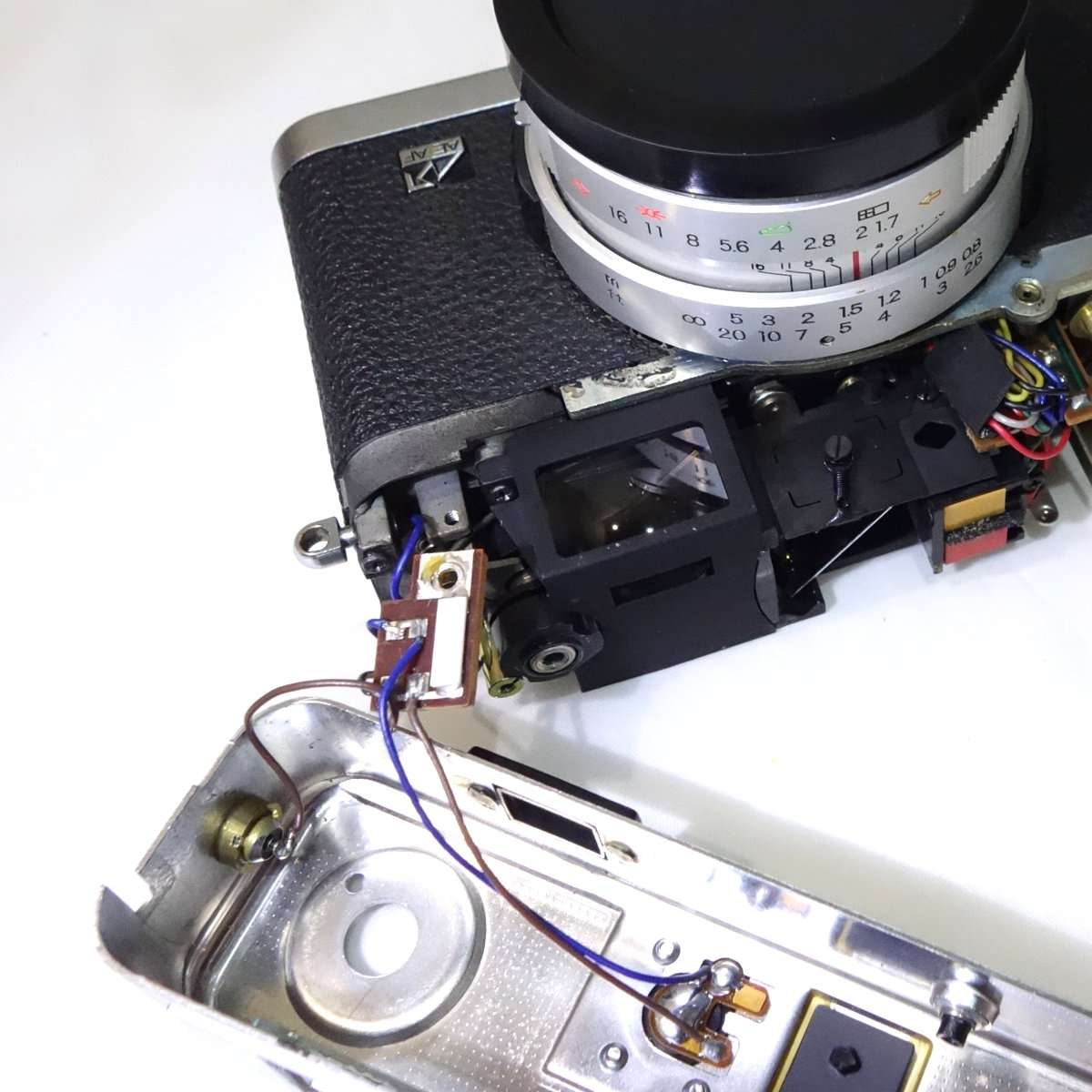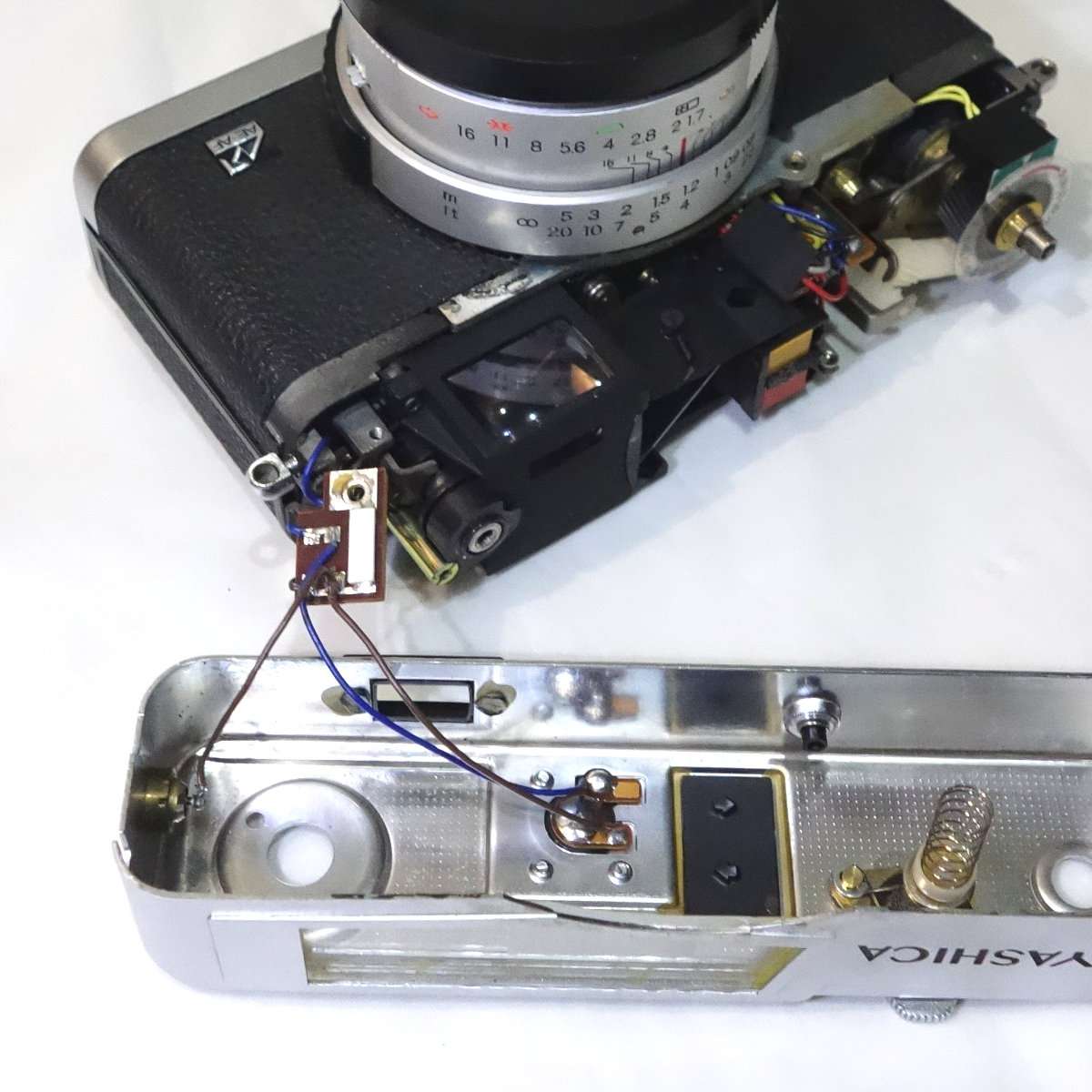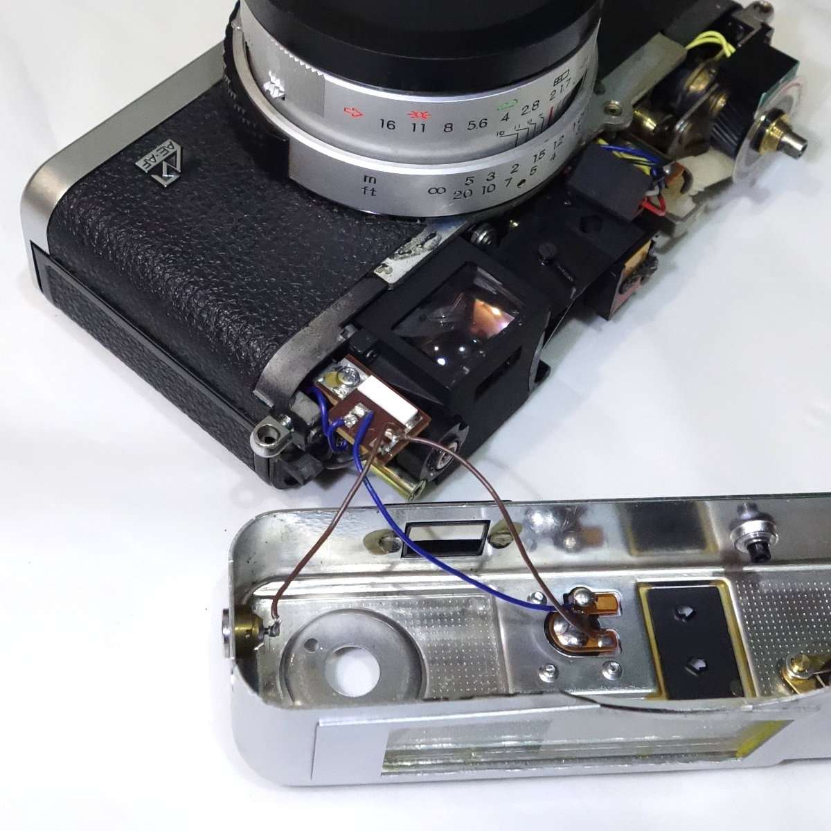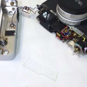 どのカメラも大体そうですが、配線はギリギリの長さで作られている事が多いです。ミノルタハイマチックEはかなり長めの配線ですが、コニカC35などは組み立てが優先でメンテナンスをする事は考えてなかったような作りです。半田をはずせばいいだけですが、基盤や端子にも寿命があるのでなるべく半田は使わず済ませたいところです。