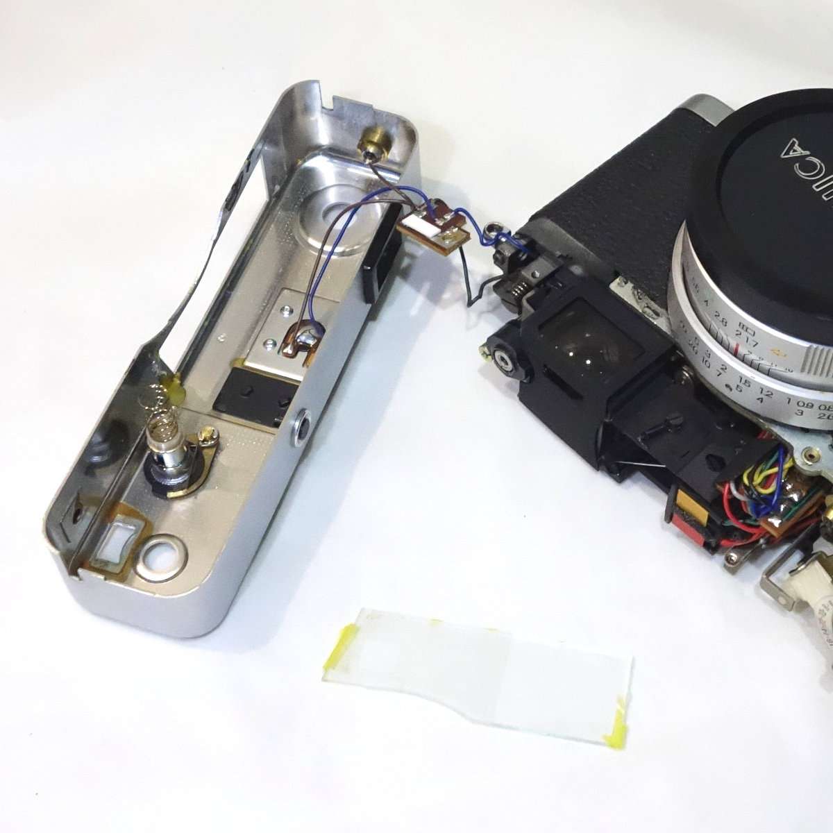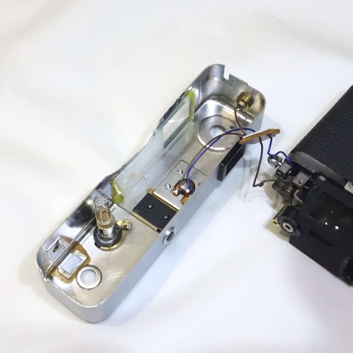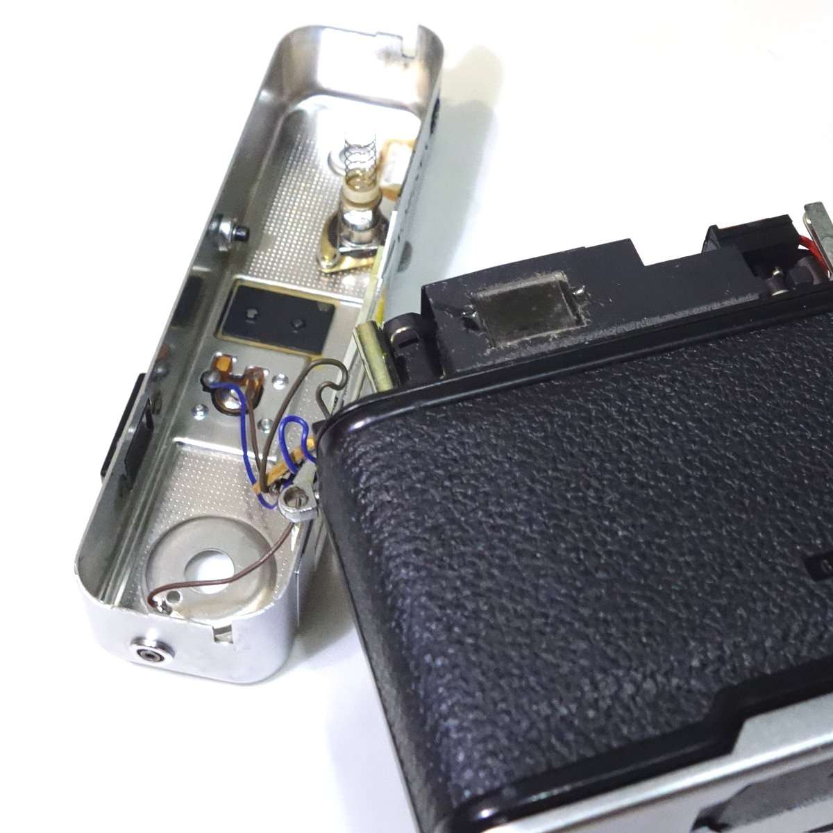 どのカメラも大体そうですが、配線はギリギリの長さで作られている事が多いです。ミノルタハイマチックEはかなり長めの配線ですが、コニカC35などは組み立てが優先でメンテナンスをする事は考えてなかったような作りです。半田をはずせばいいだけですが、基盤や端子にも寿命があるのでなるべく半田は使わず済ませたいところです。
